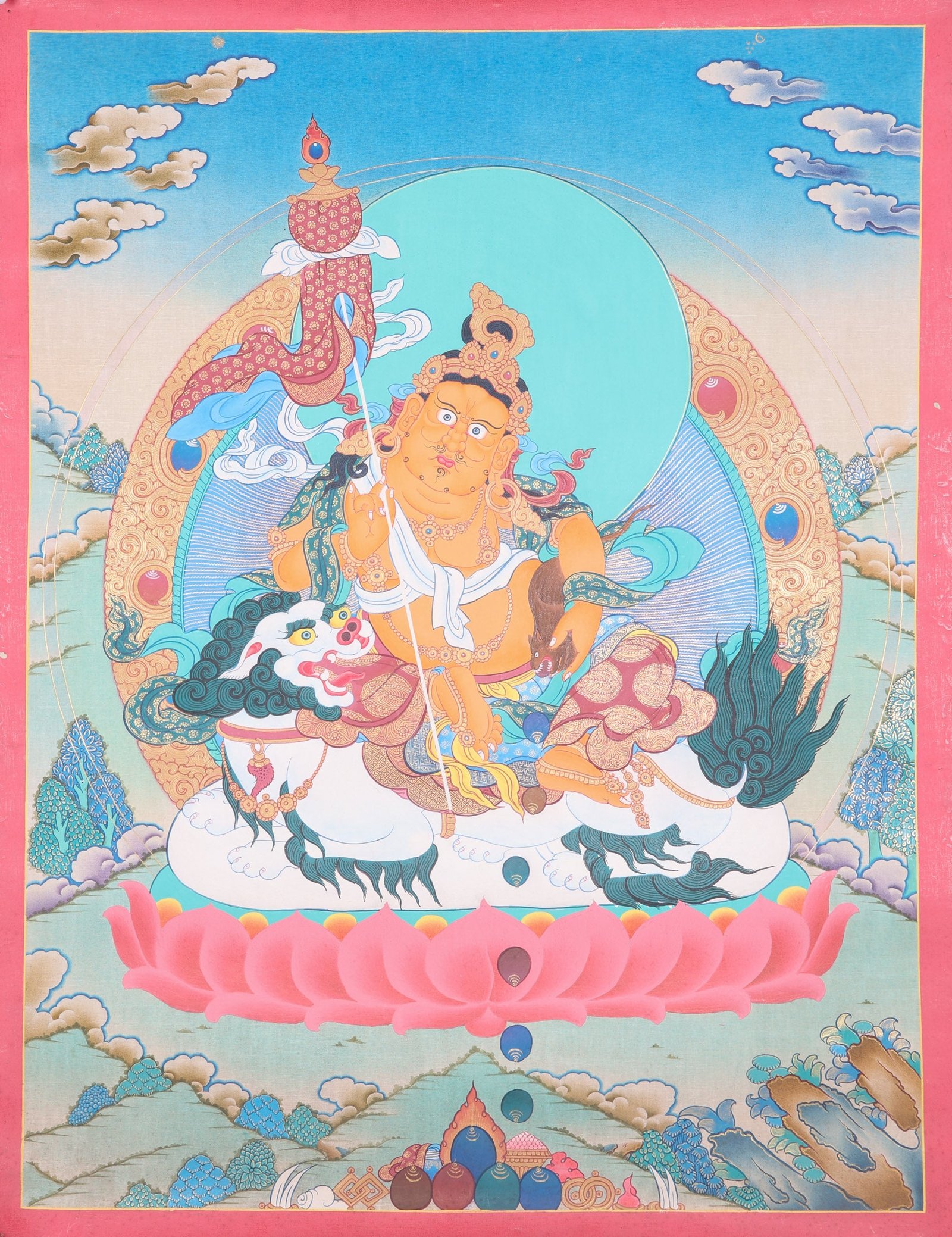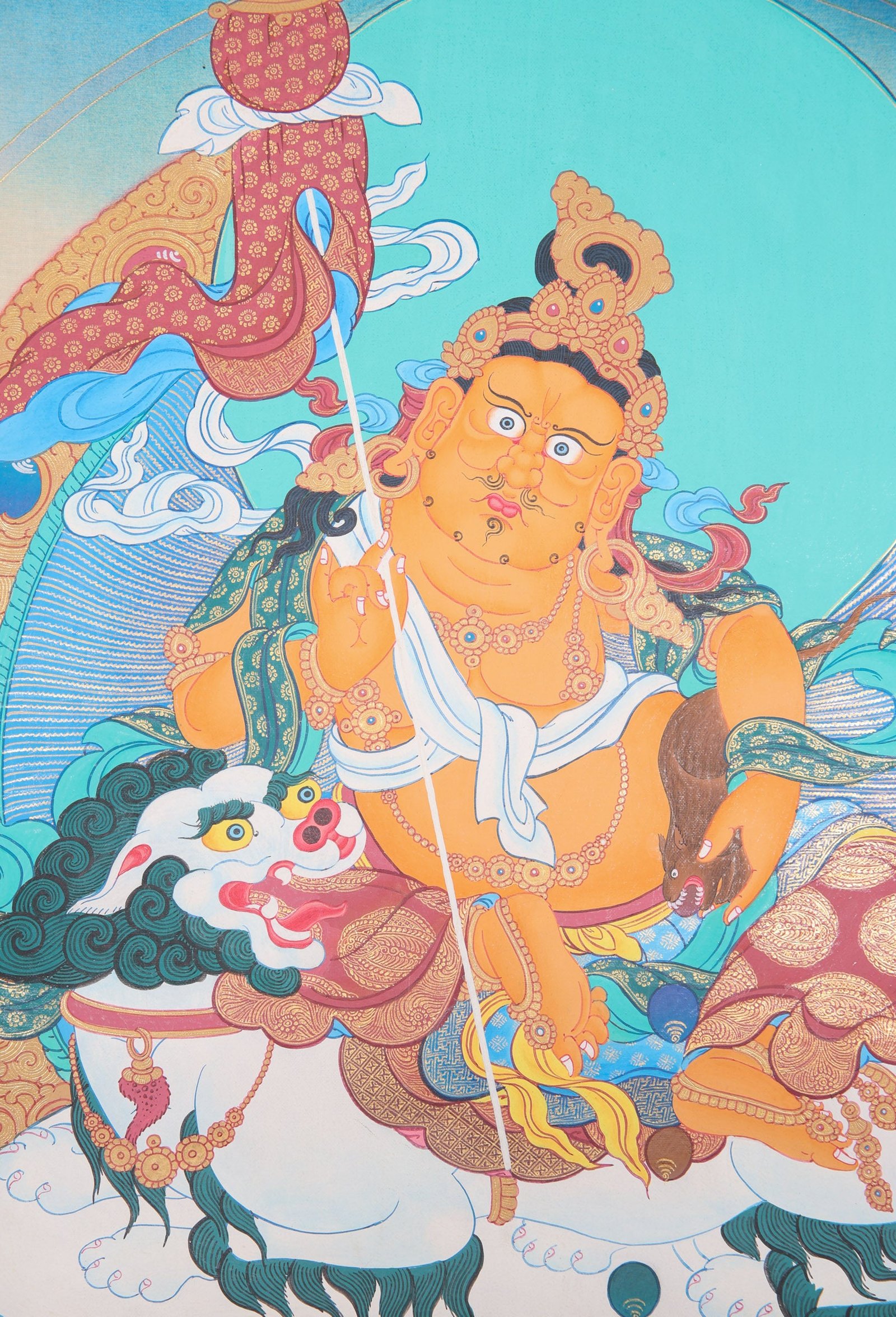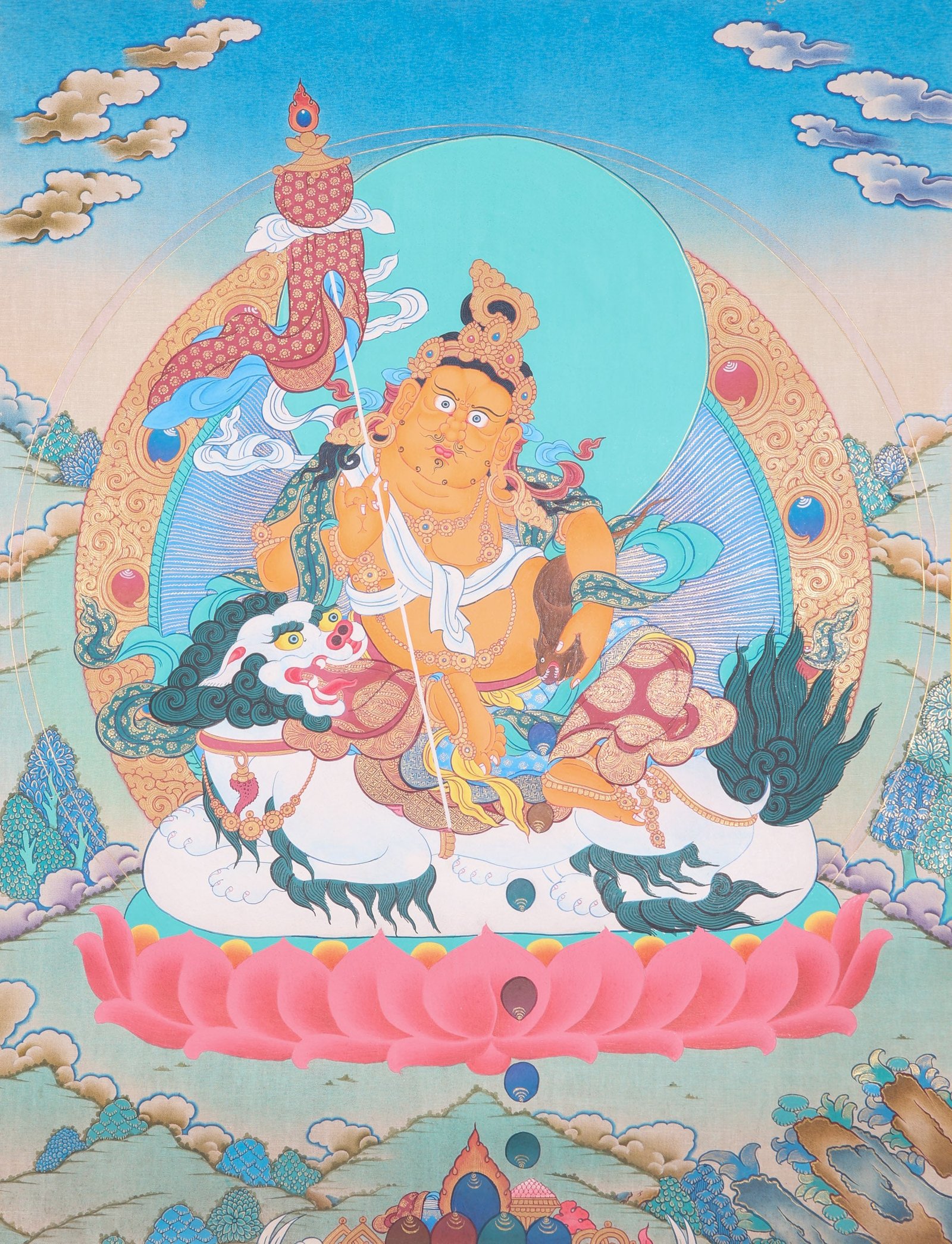The Singh Zambala Thangka Painting presents Kuber, also called Jambhala or Dzambhala, atop a lotus-embellished throne with regal lion accents. Its tones and details signify the importance of Kuber as a symbol of wealth and the ability to conquer financial troubles. Kuber’s yellow color signifies vast wealth, and in his hands he holds symbols of luck, such as a gem-spewing mongoose and a citron.