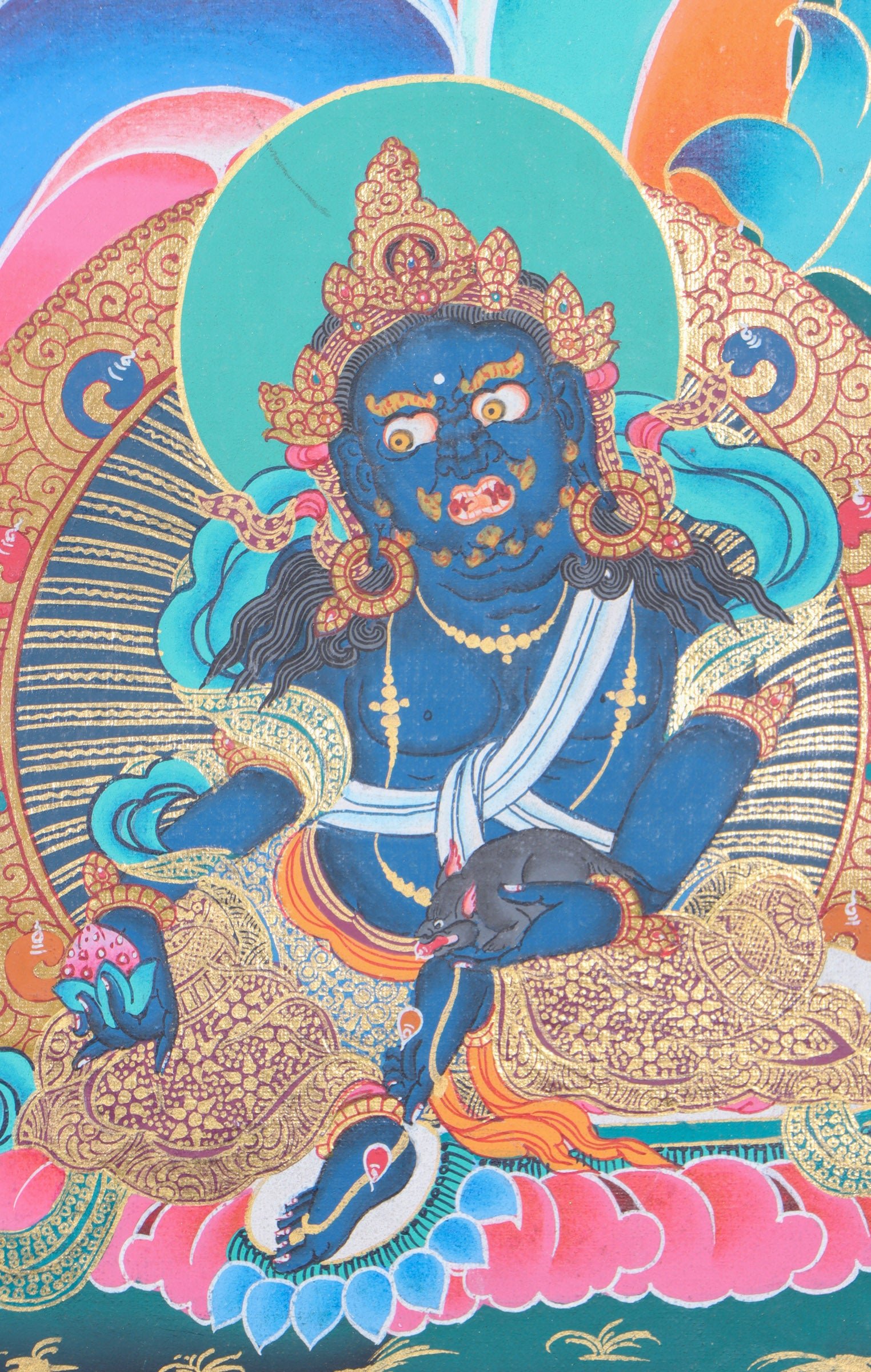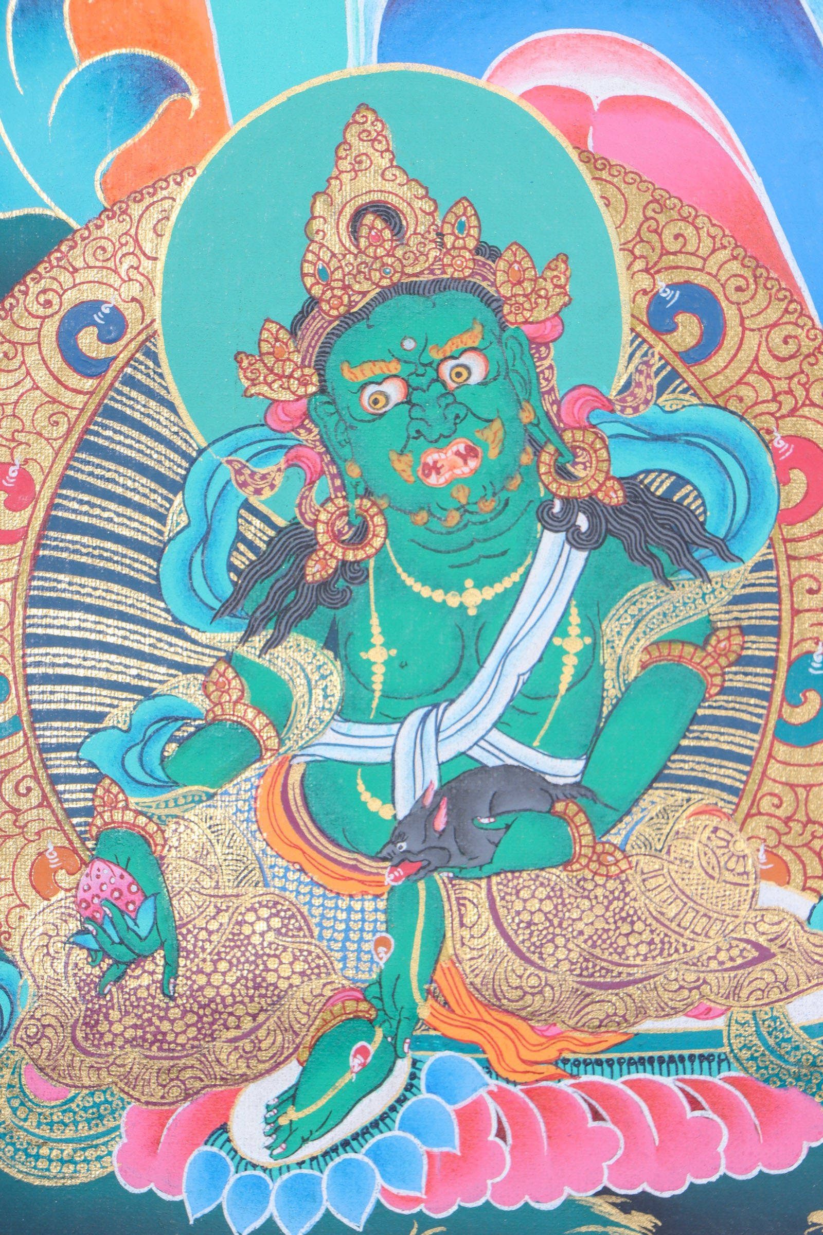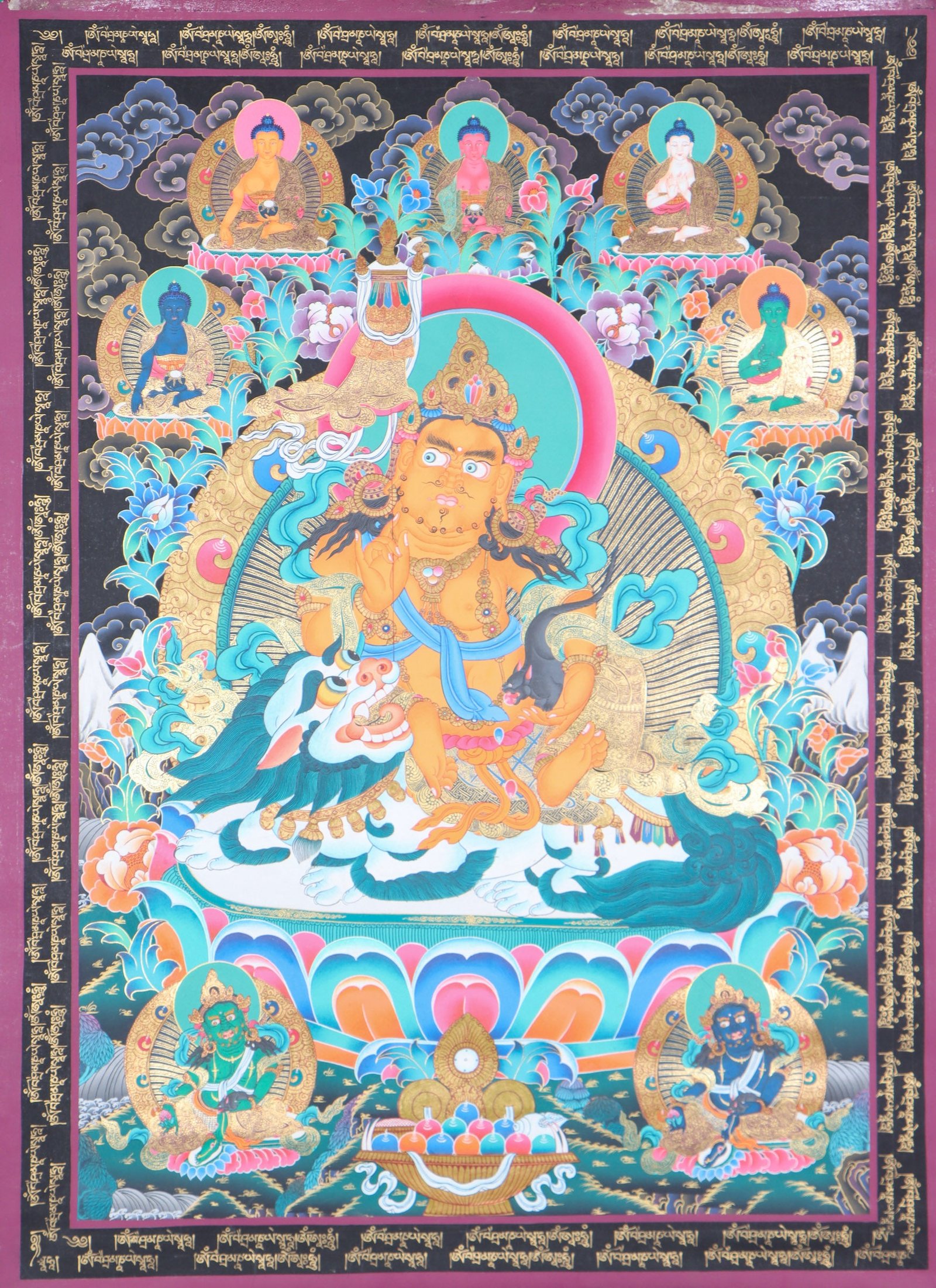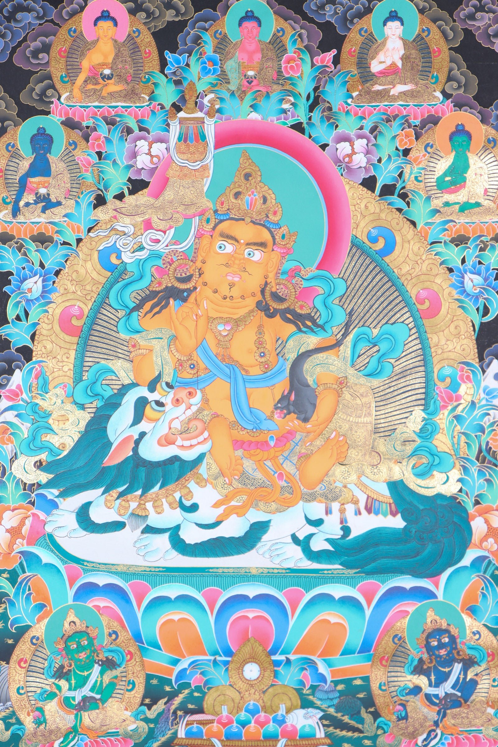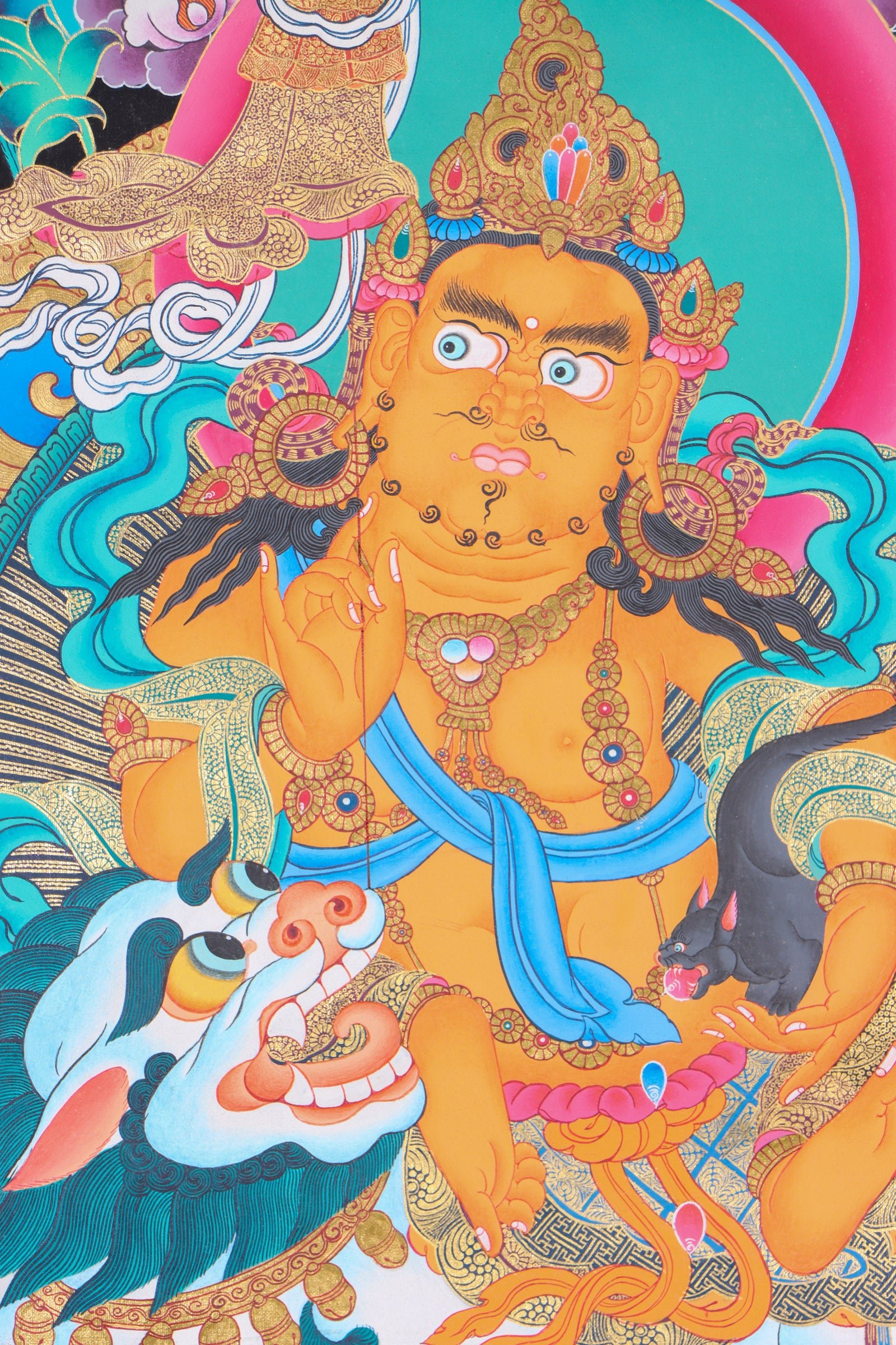 Singha Zambala Thangka Painting portrays Zambala (also known as Jambhala or Dzambhala), one of the Four Directional Wealth Deities venerated by Tibetan Buddhism and other Himalayan Buddhist customs. Zambala’s are associated with accruing wealth, bringing prosperity, and fending off financial distress.