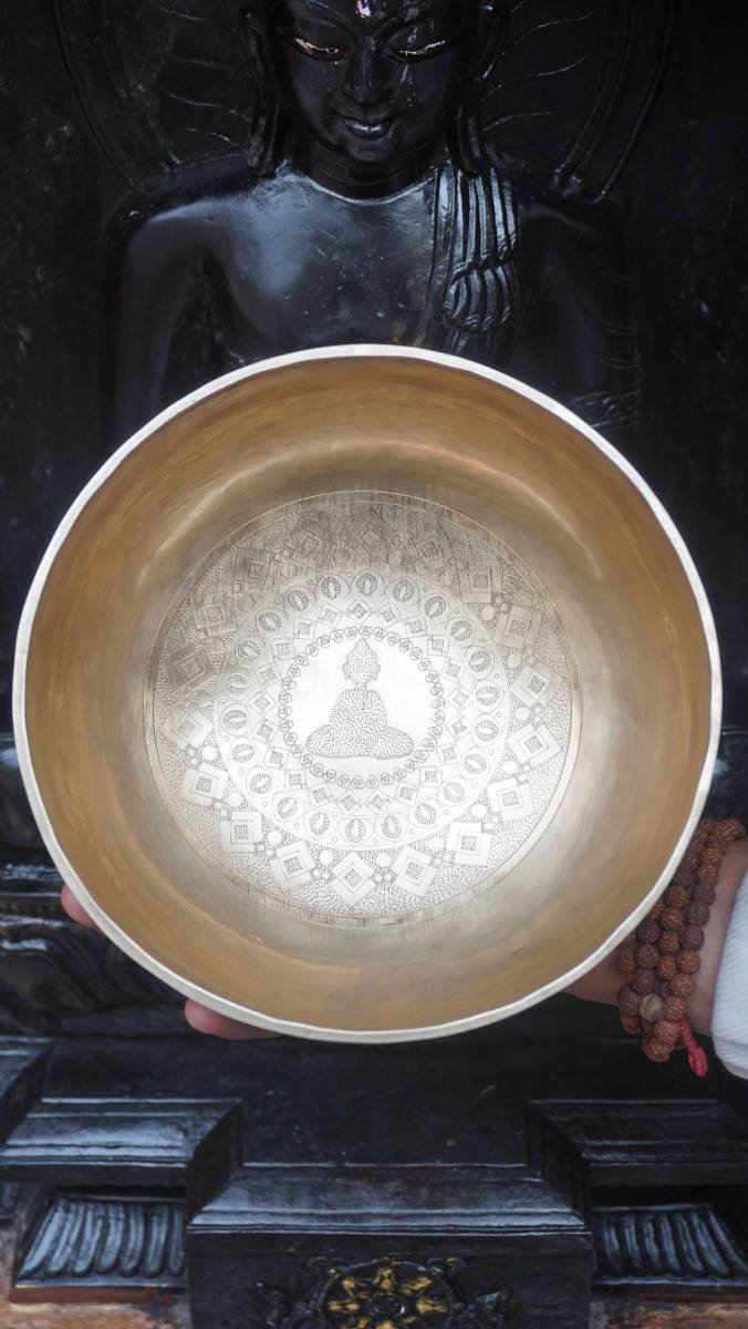 This exquisite handcrafted singing bowl is a perfect blend of artistry, spirituality, and functionality. The interior features a meticulously engraved Buddha figure in deep meditation , symbolizing inner peace, wisdom, and enlightenment. Surrounding this serene image is an elaborate mandala-inspired pattern , consisting of concentric circles filled with intricate geometric shapes and sacred symbols. Every detail of this bowl, from the delicate dot engravings to the symmetrical design , showcases exceptional craftsmanship, making it not only a powerful meditative tool but also a stunning spiritual artifact .