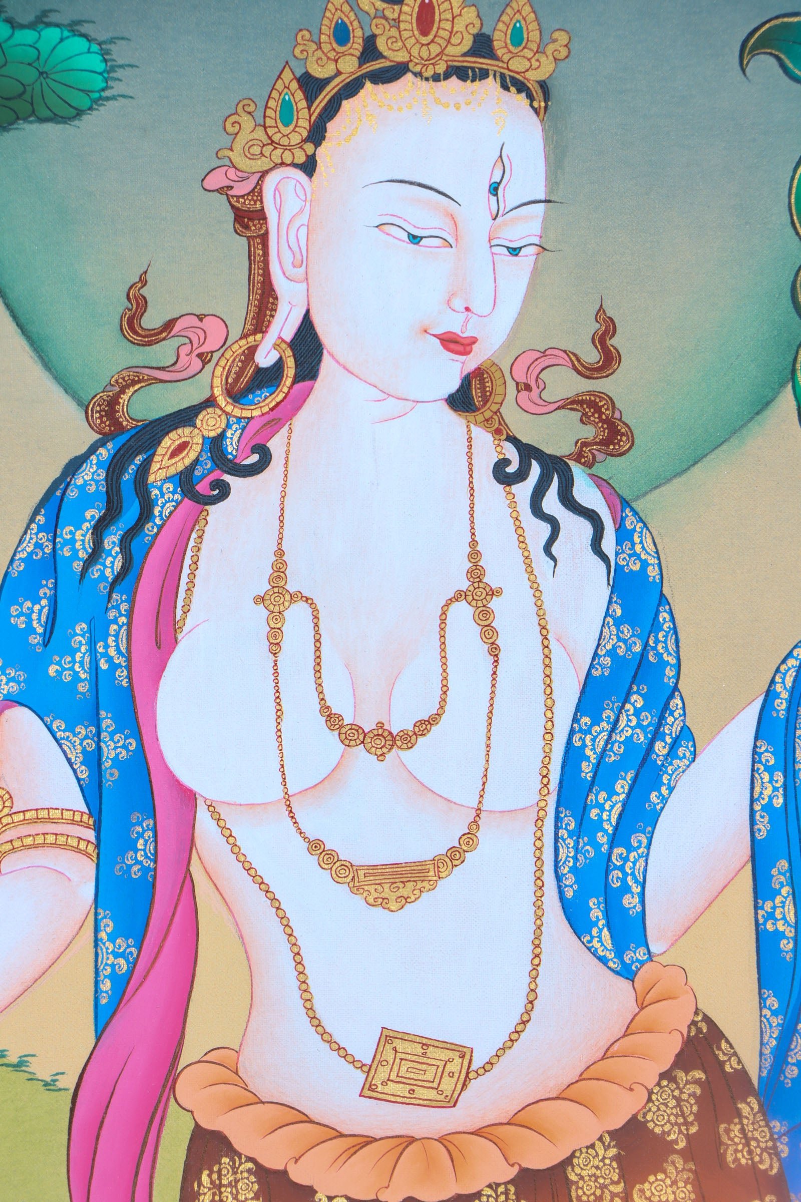 This Standing White Tara Thangka Painting is a distinct form of painting depicting the compassionate White Tara figure from Tibetan Buddhism, which symbolizes healing and longevity. Showcasing stunning craftsmanship and intricate detailing, this work of art is perfect for any home and serves as a reminder of the potent power of compassion.