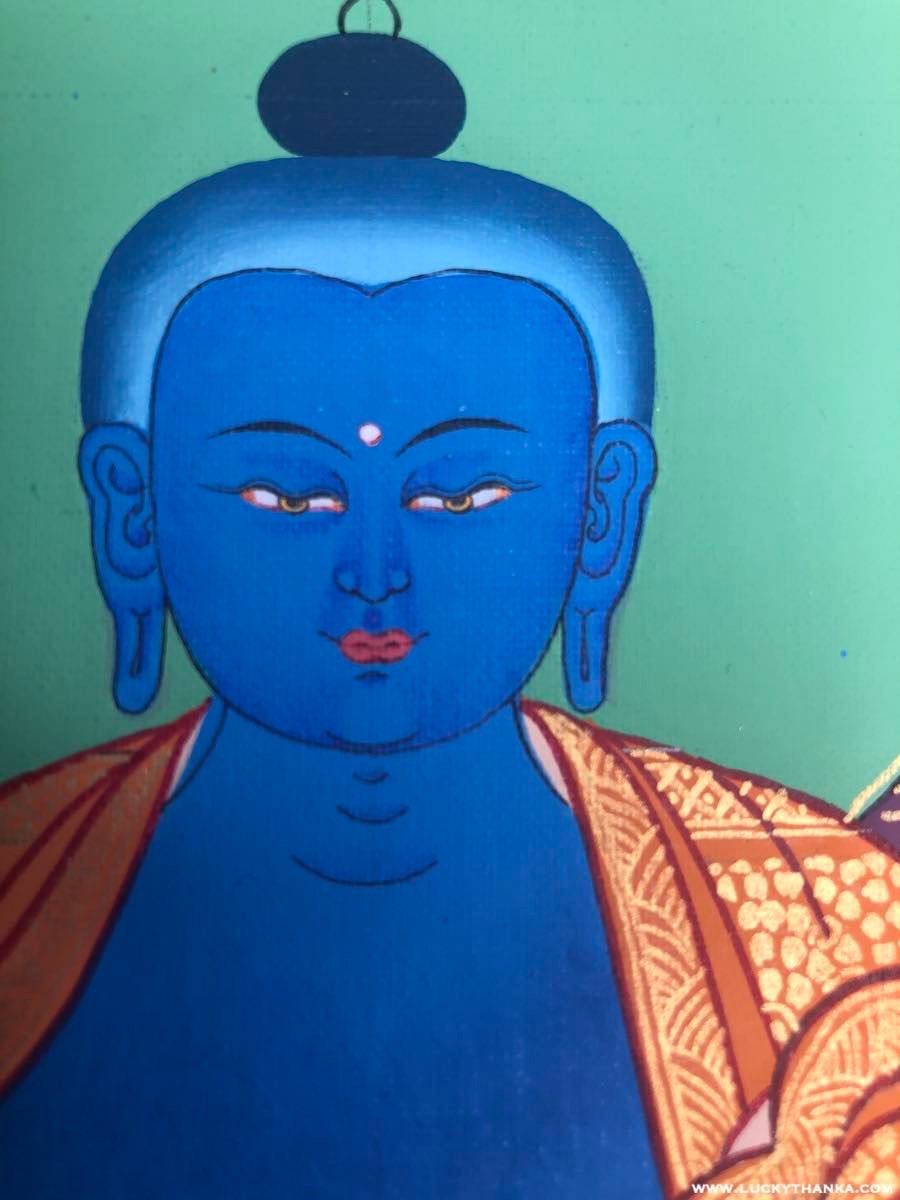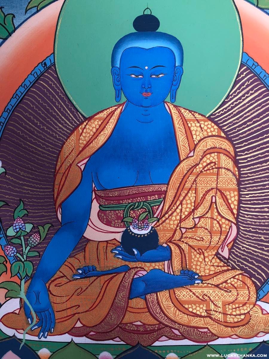 Thangka Painting of a Medicine Buddha for Spirituality, Meditation or for your home. All Thangka Paintings at Lucky Thanka are genuine hand painted from Nepal by highly skilled lama artists. Painted on cotton canvas using natural stone color and other materials like gold, silver other semi precious minerals. The Medicine Buddha or Bhaisajyaguru can be a great tool for meditation to transform and purify our Body, Speech and mind. These art can also be a very beautiful wall hanging decoration ideas for your home and office.