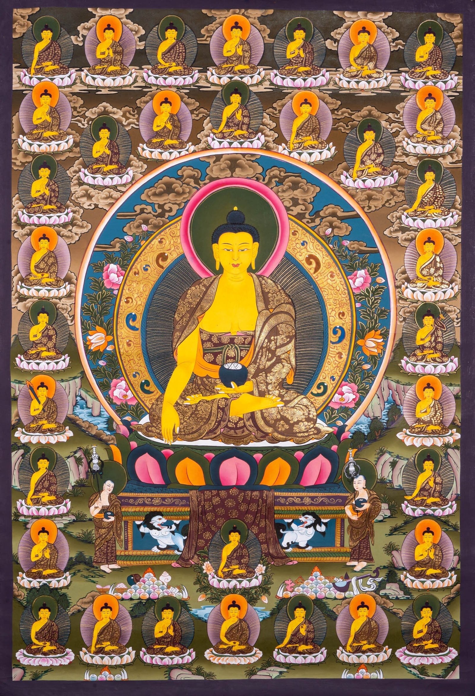Buddhist Thangka painting depicting Shakyamuni Buddha is perfect for various home decor ideas! All our Thangka paintings and Tibetan mandala. This 100% hand-drawn Thangka painting in Kathmandu Valley, Nepal. Thangka painting can be decorated as an elegant and eccentric wall hanging in your home or office being a centerpiece of attention. It can also be placed on your family altar for meditation purposes as well as spiritual and emotional healing, attracting benevolent energy of the Tibetan Buddhist art. This is one of our best collection high quality Buddha Thangka art.