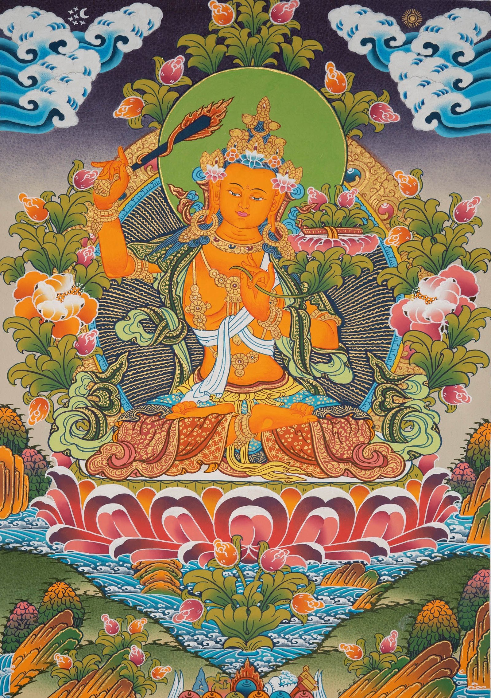 This hand-painted Tibetan Manjushri Thangka is a sacred representation of wisdom, clarity, and enlightened understanding. Manjushri, the Bodhisattva of Wisdom, holds a flaming sword to cut through ignorance and a lotus carrying the Prajnaparamita Sutra – the scripture of ultimate knowledge. These symbols together inspire mental clarity, learning, and the illumination of truth.