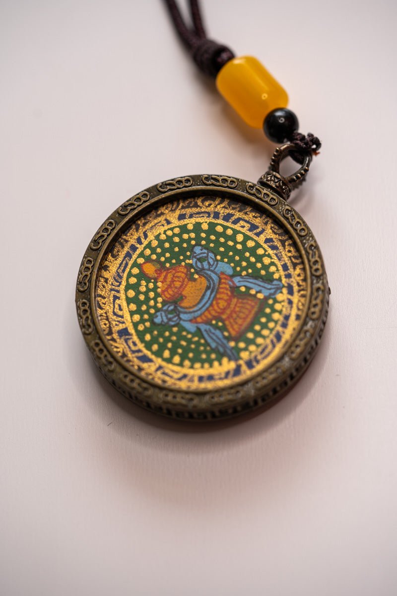 Each locket is a handcrafted miniature thangka, hand-painted on natural cotton canvas using traditional mineral pigments. Created by master Nepalese artisans, every piece carries deep symbolic meaning and individual spiritual power.