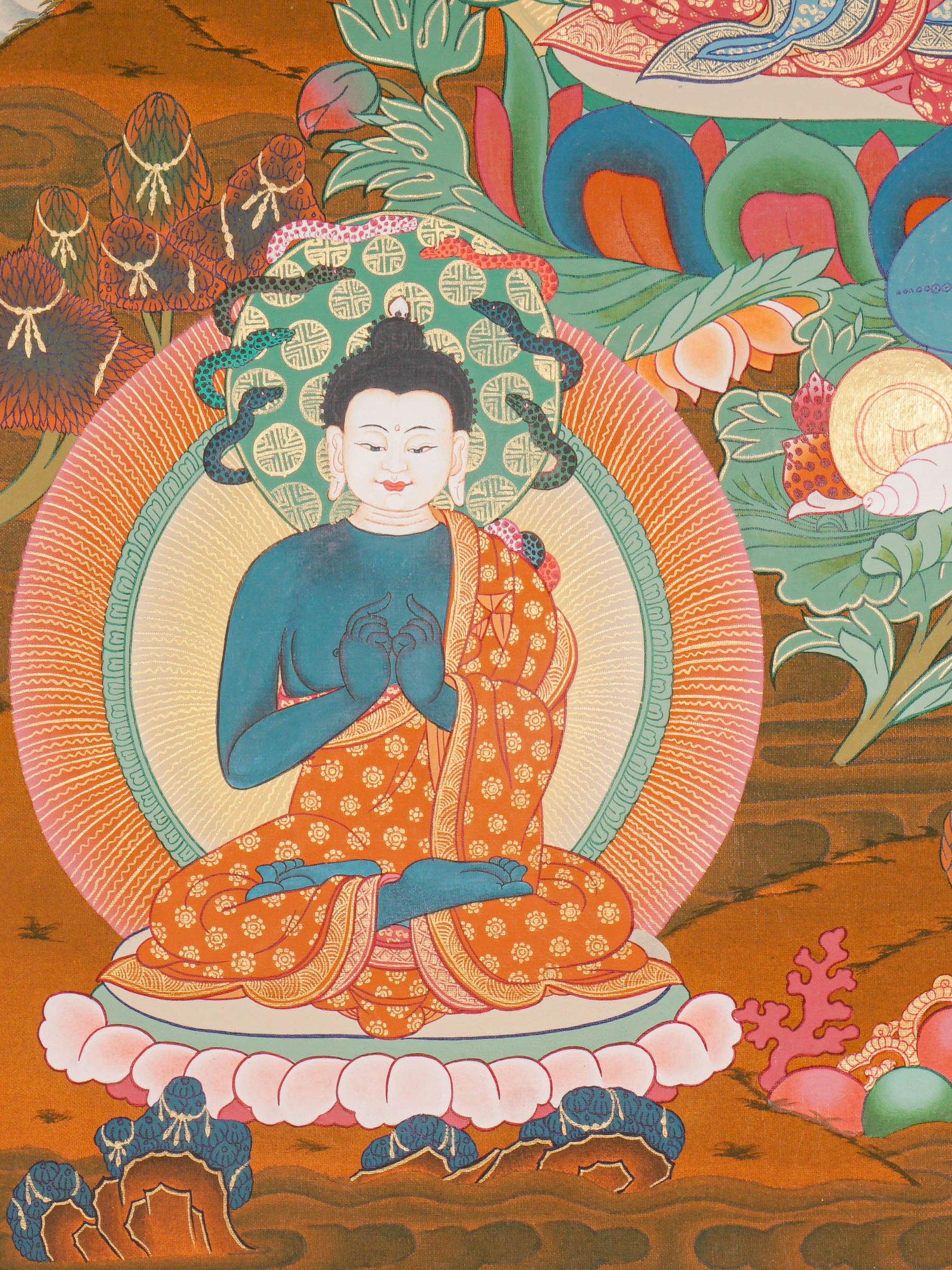Vajrasattva is a significant deity in Tibetan Buddhism, associated with purification and the removal of negative karma. The Vajrasattva Shakti Thangka Painting typically features Vajrasattva in a detailed and symbolic representation, often accompanied by consort Shakti, embodying the union of wisdom and compassion.