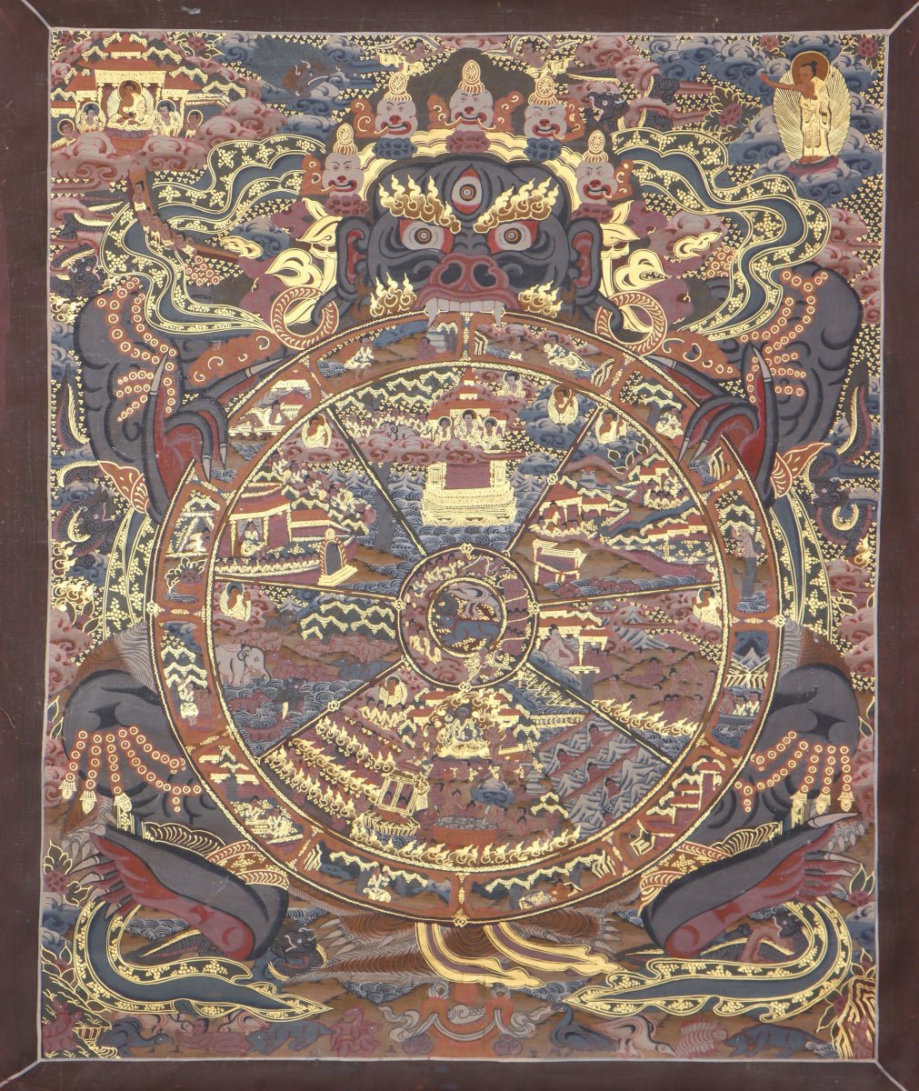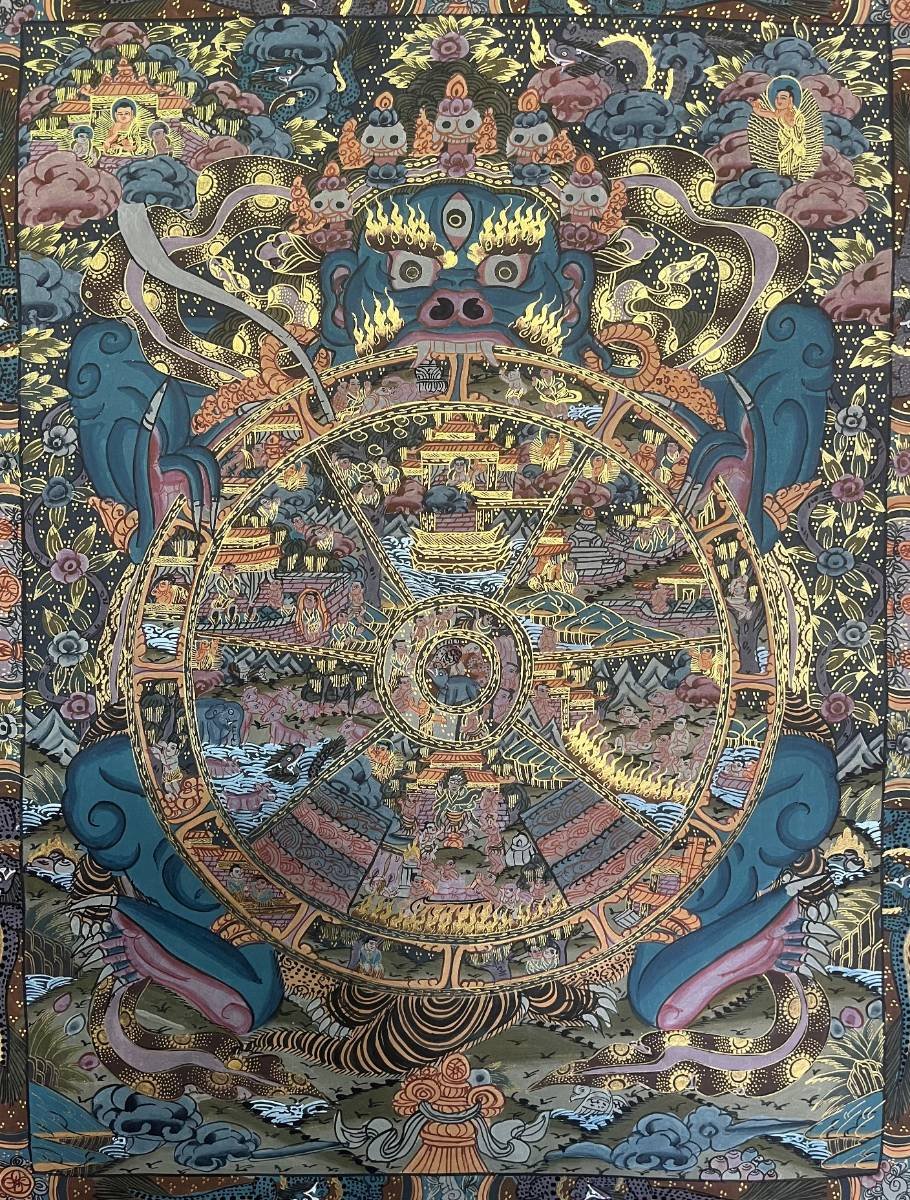 The Wheel of Life Thangka, also named Bhavachakra Thangka, is a traditional Tibetan Buddhist painting which portrays the cycle of life and the route of samsara. The term “Bhavachakra” is interpreted as “Wheel of Becoming” or “Wheel of Life”. This artwork is circular and incorporates various realms and figures.