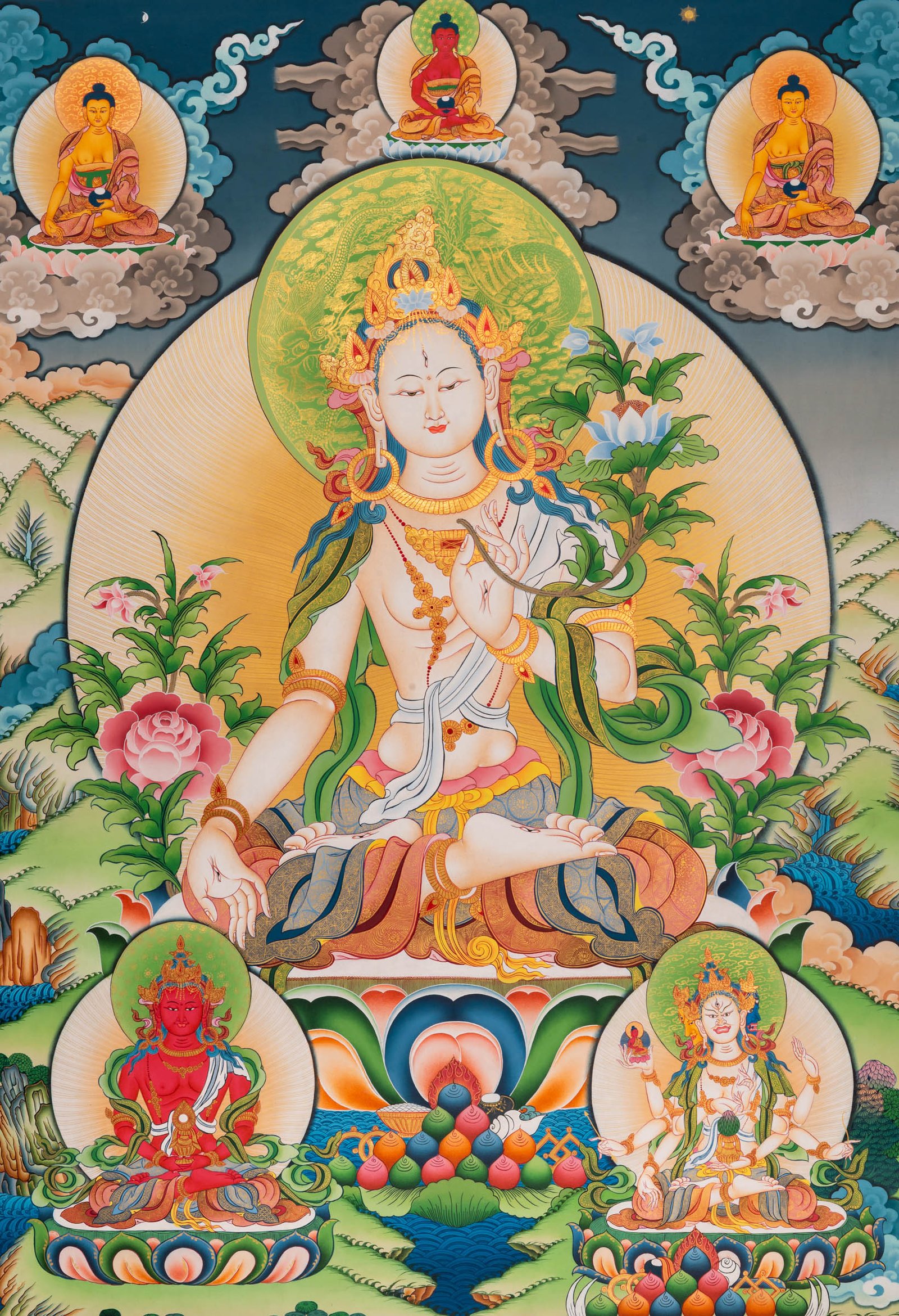 White Tara is the female Bodhisattva of compassionate activity. She is said to see all suffering and respond to requests for help. She sits cross-legged in meditation on a lotus, which symbolizes purity.