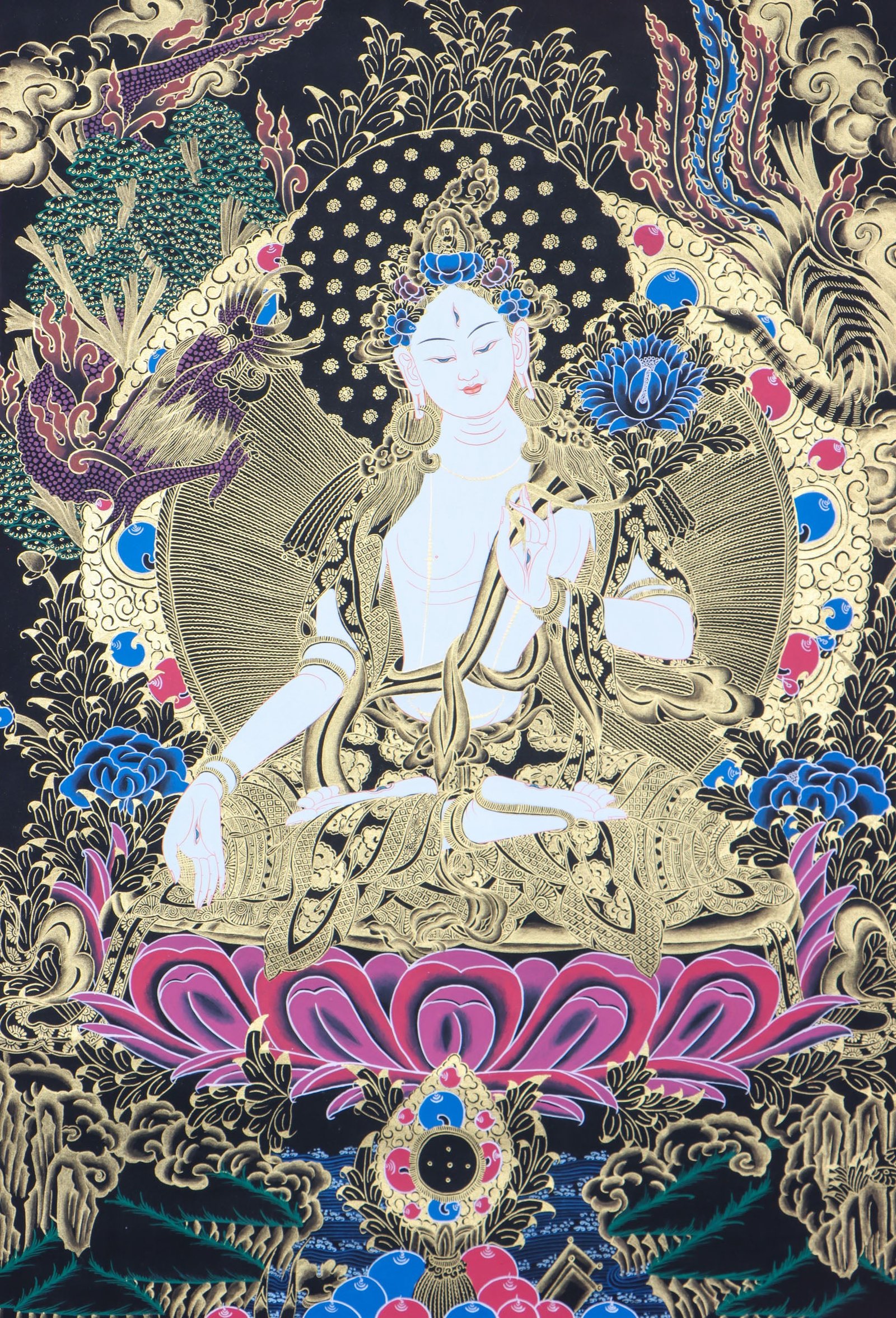 White Tara Thangka is an ancient Tibetan Buddhist artwork showcasing the compassionate deity White Tara. Admired for her compassionate nature, healing capabilities and the promise of longevity, she is said to provide protection and comfort to those devoted to her, consequently delivering peace and recovery.
