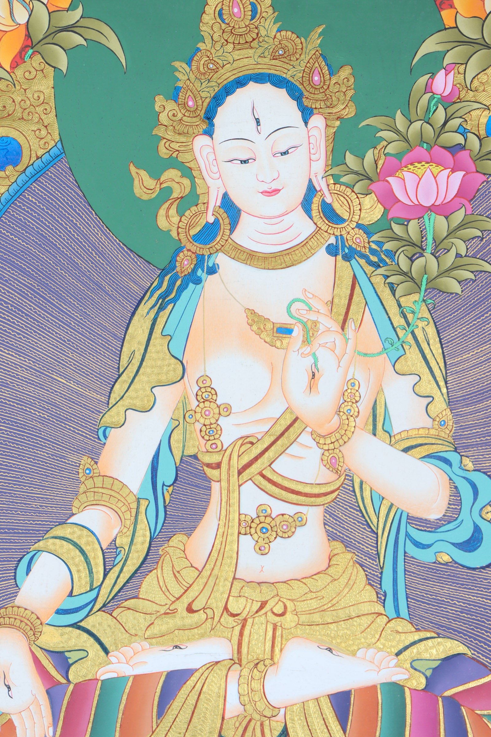 White Tara Thangka is a revered artwork in Vajrayana Buddhism, depicting ‘White Tara’ (Sita Tara/Sitatara) to signify compassion, healing, and longevity. Handcrafted with traditional colors and natural dyes, this meaningful piece of art is perfect to be cherished for generations.