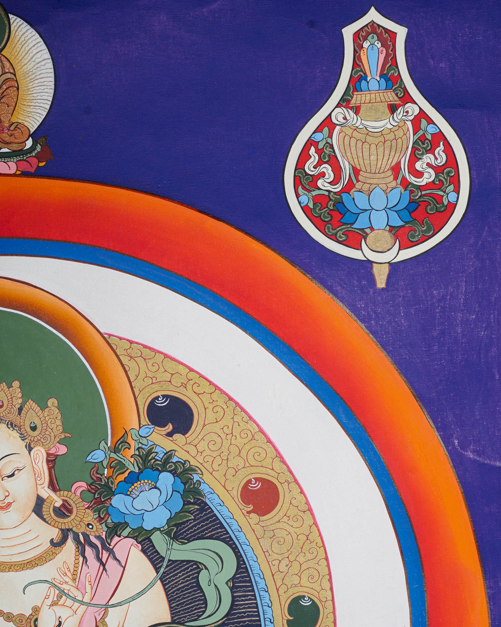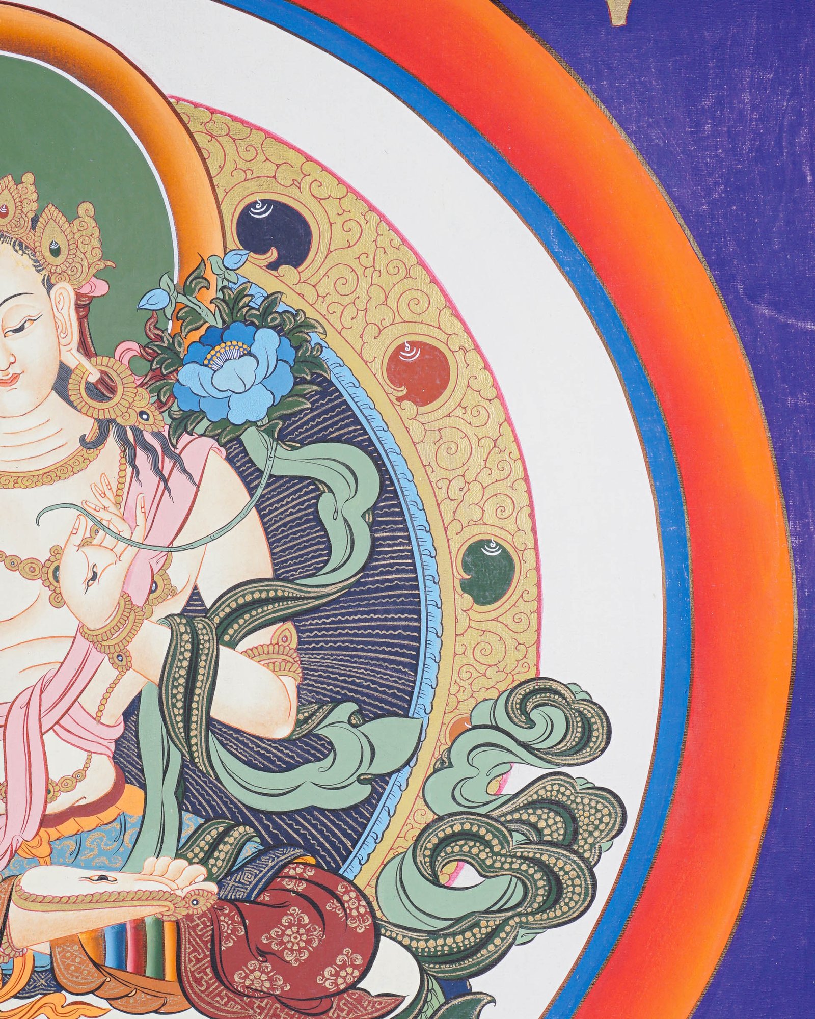 White Tara, the central figure of the painting, is depicted a peaceful, graceful, and youthful female deity embodying compassionate and nurturing enlightenment. She is represented with a white body to represent purity, compassion and has seven eyes: three on her face (denoting her insight into past, present future) and one on her palms soles. Her right hand is adorned with the varada mudra, a sign of her willingness to grant wishes and bestow blessings. Her left is held in the padma mudra, symbolizing compassion and purity. She is adorned with a crown, jewelry, silk garments to signify her spiritual nature is depicted seated on a lotus throne, a sign of enlightenment rising from worldly affairs. The painting also features celestial or natural scenery, clouds, and additional figures to add an aura of serenity.