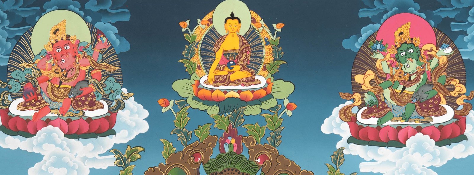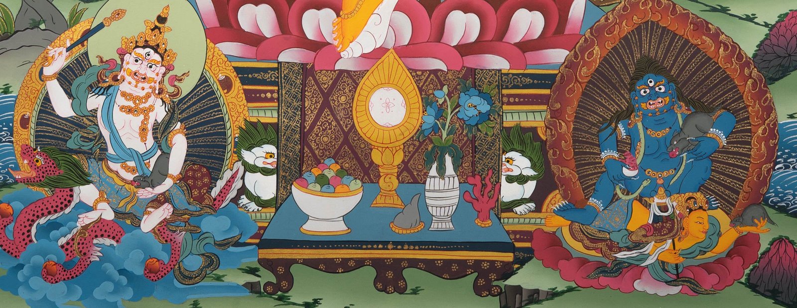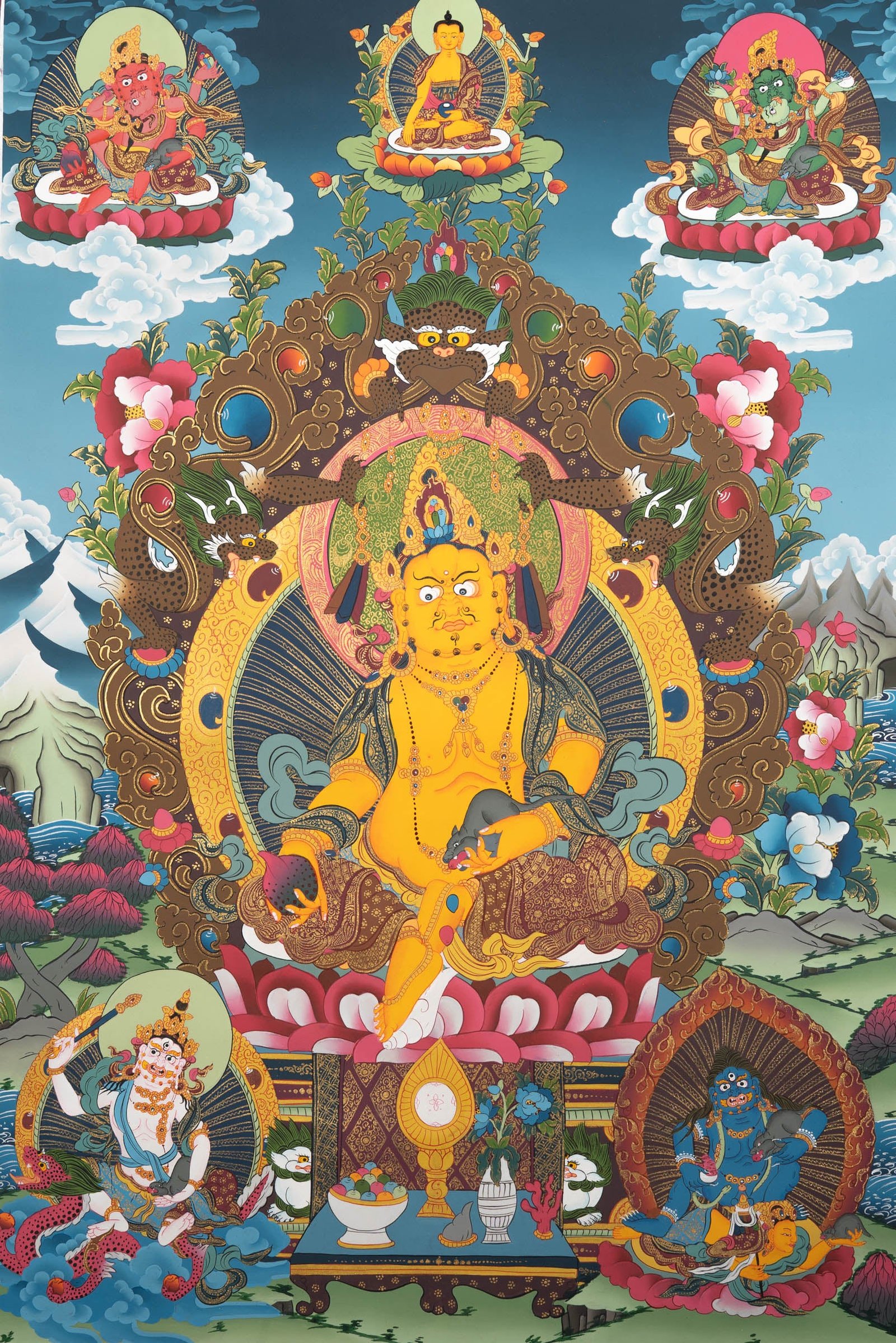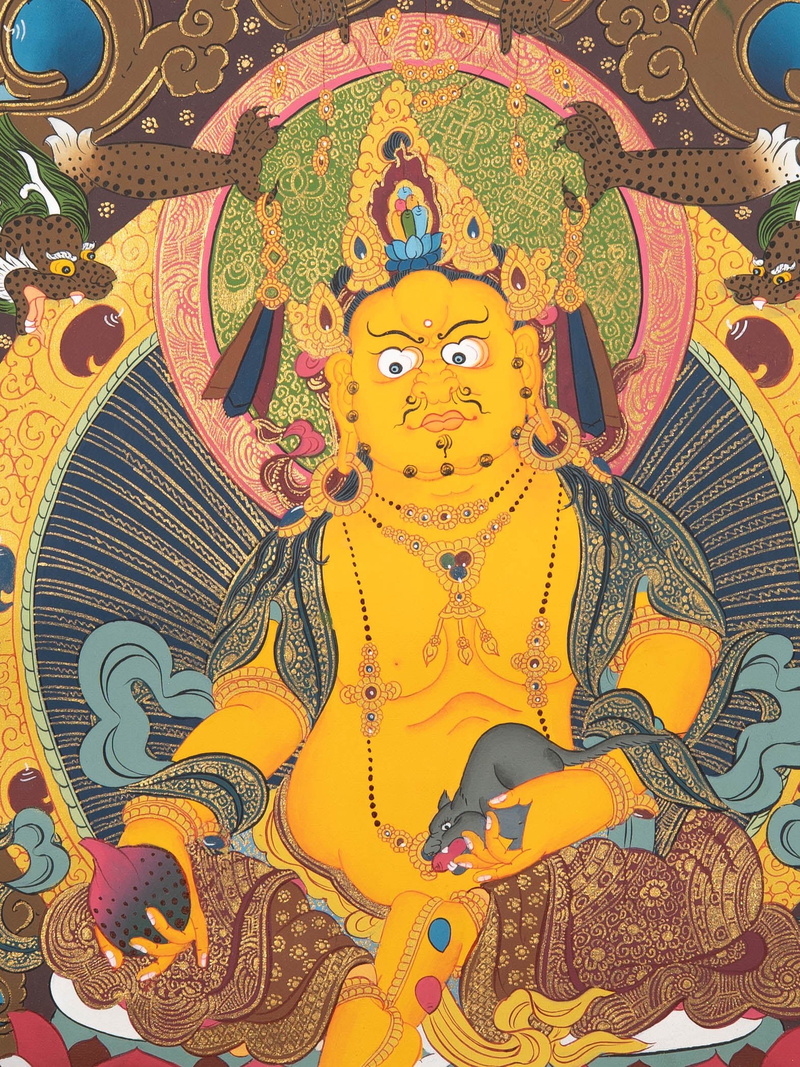 Zambala is traditionally portrayed seated or standing on a lotus throne, holding a mongoose that spills jewels and often a citron fruit or treasure vase, symbolizing continuous wealth and spiritual merit. His yellow body represents prosperity, spiritual abundance, and virtuous merit. The surrounding elements including grains, jewels, and swirling water – illustrate the flow of fortune and good karma, reinforcing his role as a provider of both material and spiritual wealth.