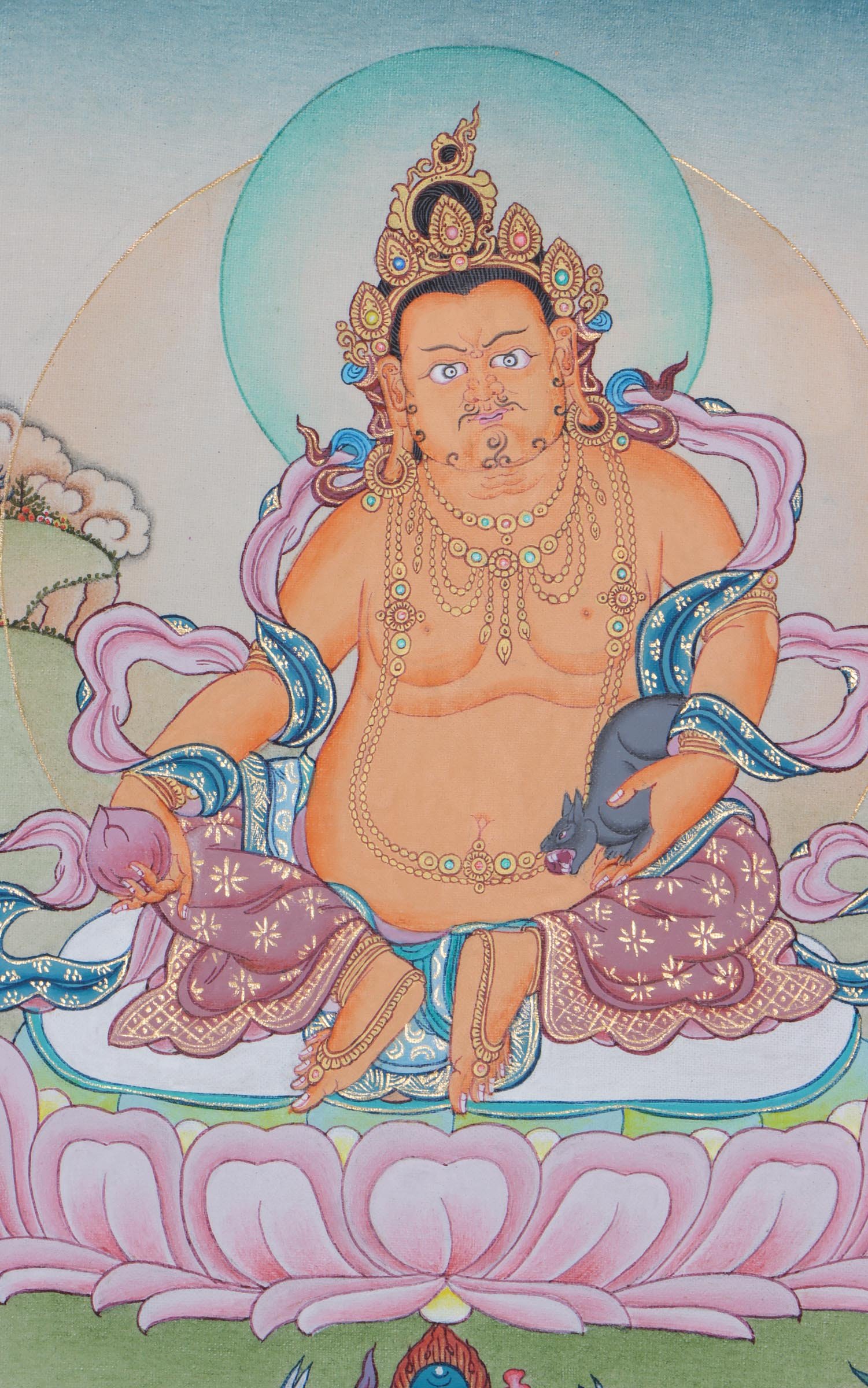 Zambala, Dzambala is a wealth deity whose blessings remove barriers to prosperity, enabling Dharma practitioners to attain spiritual realizations. According to Sutras, when demons attempted to disrupt the Buddha, Jambhala bravely defended him. Recognizing the protector’s courageous act, the Buddha asked Jambhala to become a Dharma Protector, to aid all beings. Jambhala accepted and his blessings deliver good luck, long life, higher intelligence and both material and spiritual gains.