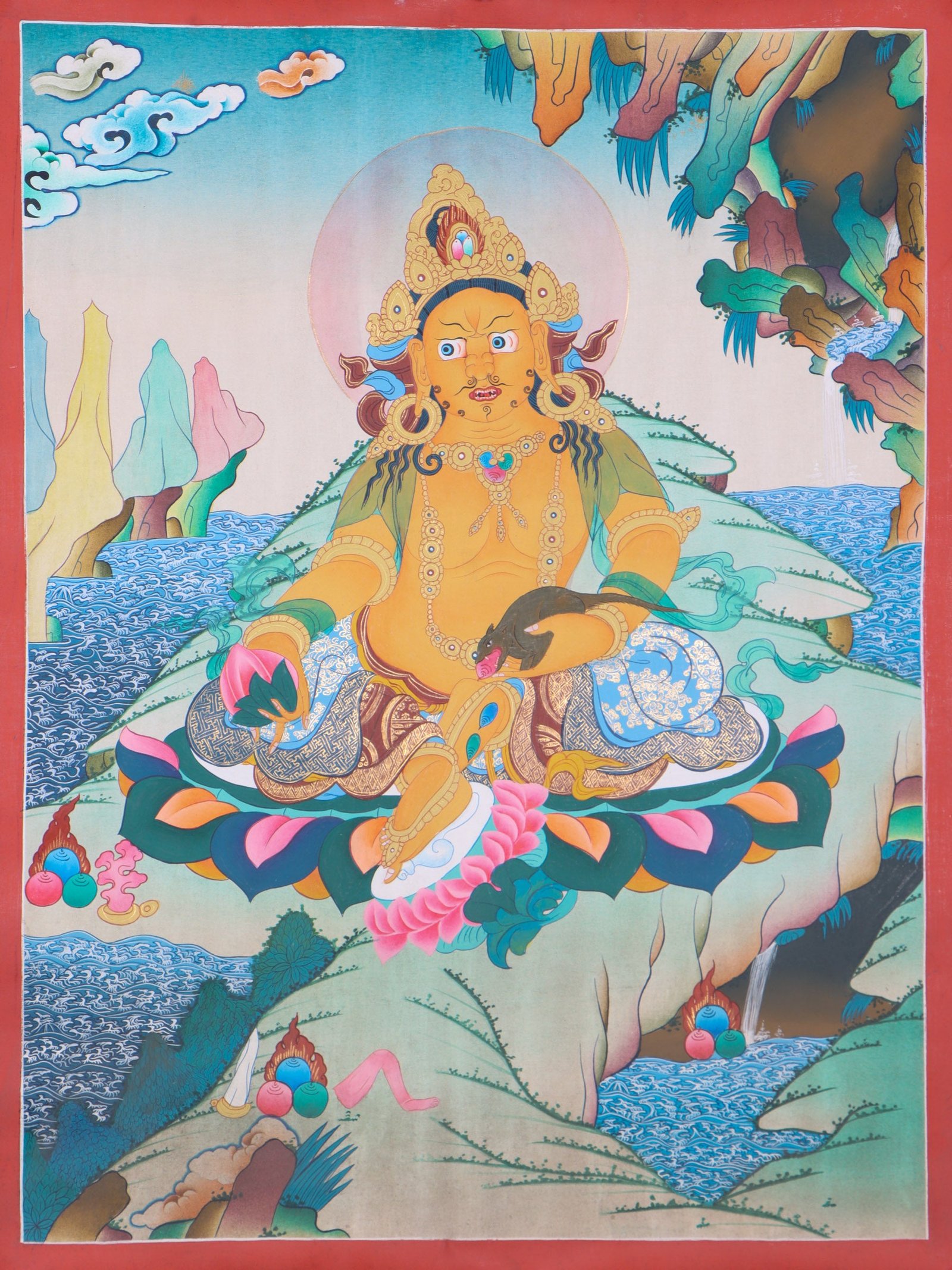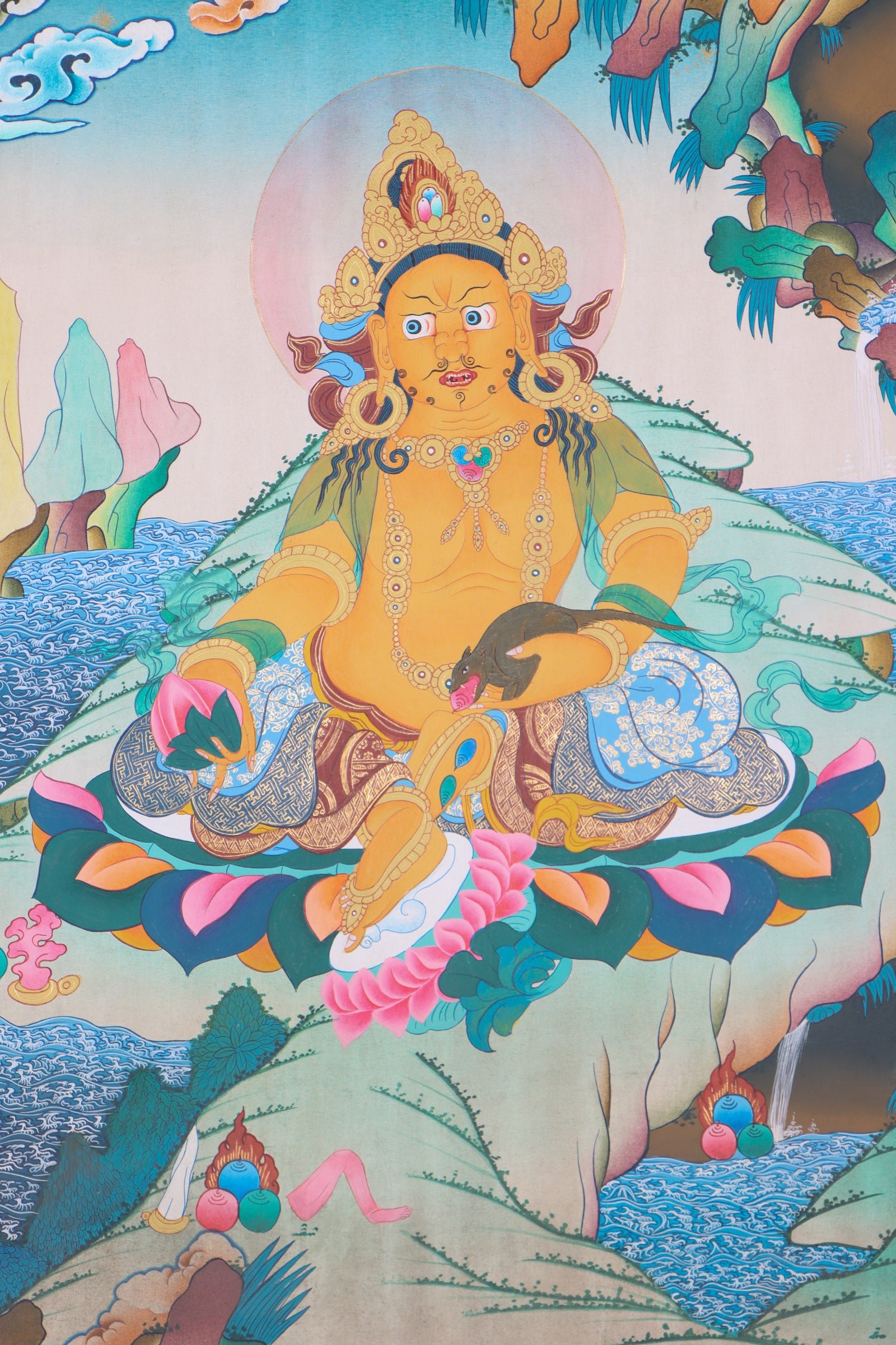 Zambala appears in thangkas as a youthful figure adorned in jewels and gold, indicating his ties to both riches and spirituality. Seated on a lotus throne, he holds a mongoose in his left hand, producing an abundance of gems. Representing prosperity, success, and protection, this imagery is a popular way to bring the energy of wealth into everyday life. By displaying Zambala thangkas, individuals can connect with these powerful energies and manifest prosperity in their own lives.