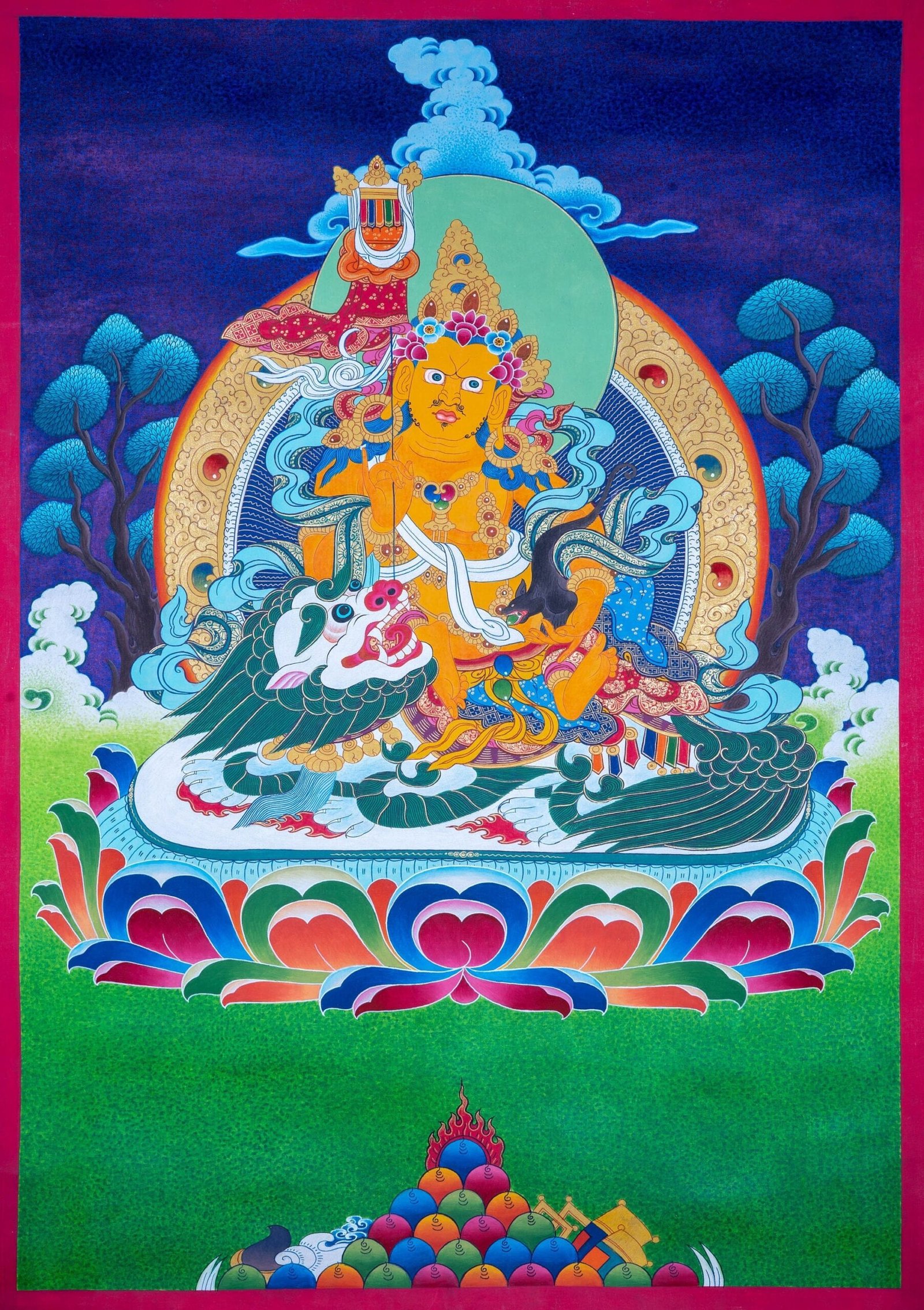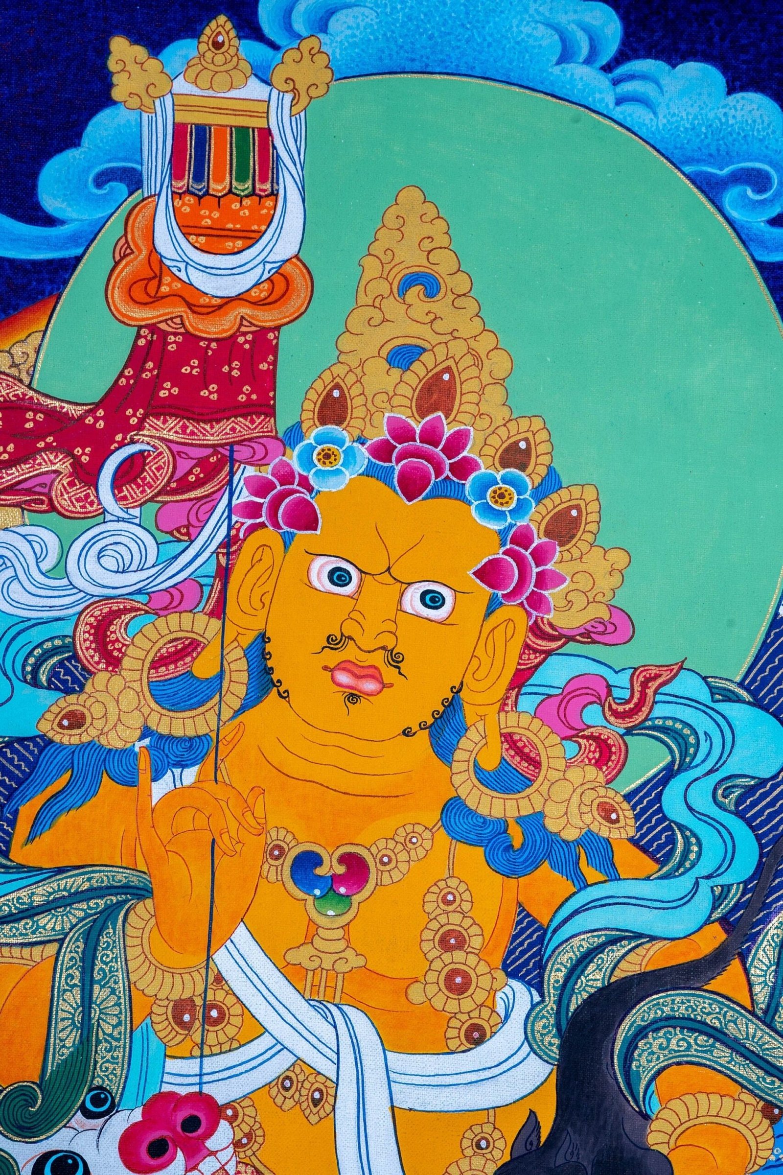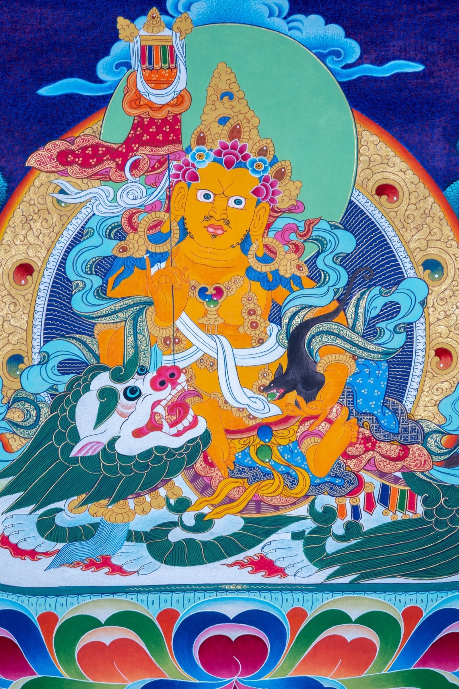 Zambala, Dzambala is a wealth deity whose blessings remove the obstacle of poverty, bringing wealth and abundance to pure Dharma practitioners. As it is difficult to attain spiritual realizations while afflicted by lack of resources, Jambhala generates prosperity so that practitioners have the time, energy, and means to accomplish. According to the Sutras, while Shakyamuni Buddha was teaching one day, demons tried to disturb and confuse the Buddha. Jambhala appeared in front of the Buddha and protected him. Recognizing Jambhala’s courageous action, the Buddha asked Jambhala if he would like to become a Dharma Protector in order to help all sentient beings. Jambhala accepted the Buddha’s offer, and since then he has offered immediate assistance to all who call his name or chant his mantra. His blessings bestow good luck, increase virtues, prolong life, increase intelligence, and provide both material and spiritual benefits.