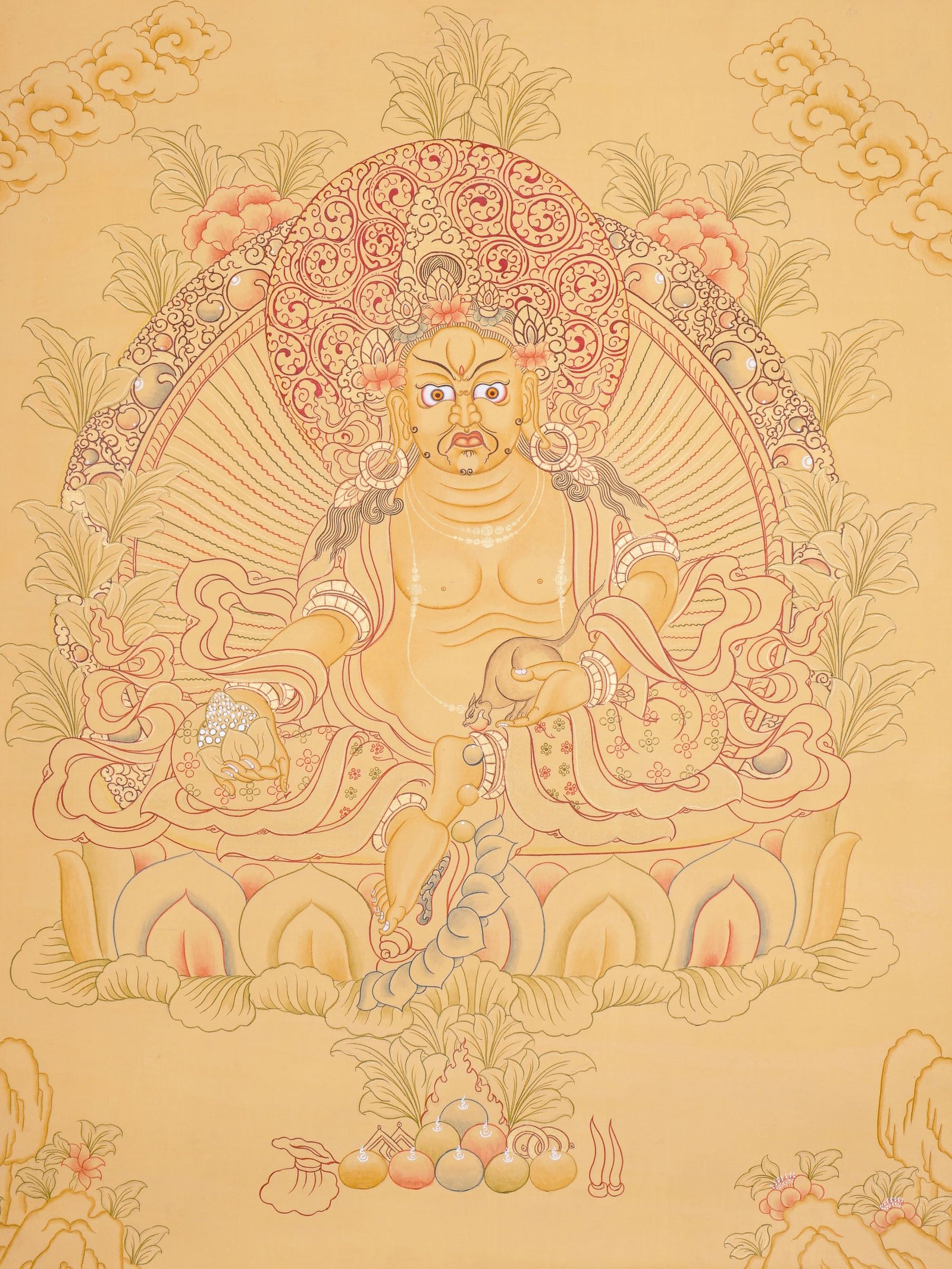 - Iconography: The Zambala Thangka Painting depicts him holding a mongoose, which represents his ability to provide devotees with endless wealth in the form of precious jewels, as well as a citron symbolizing prosperity and the fulfillment of wishes.