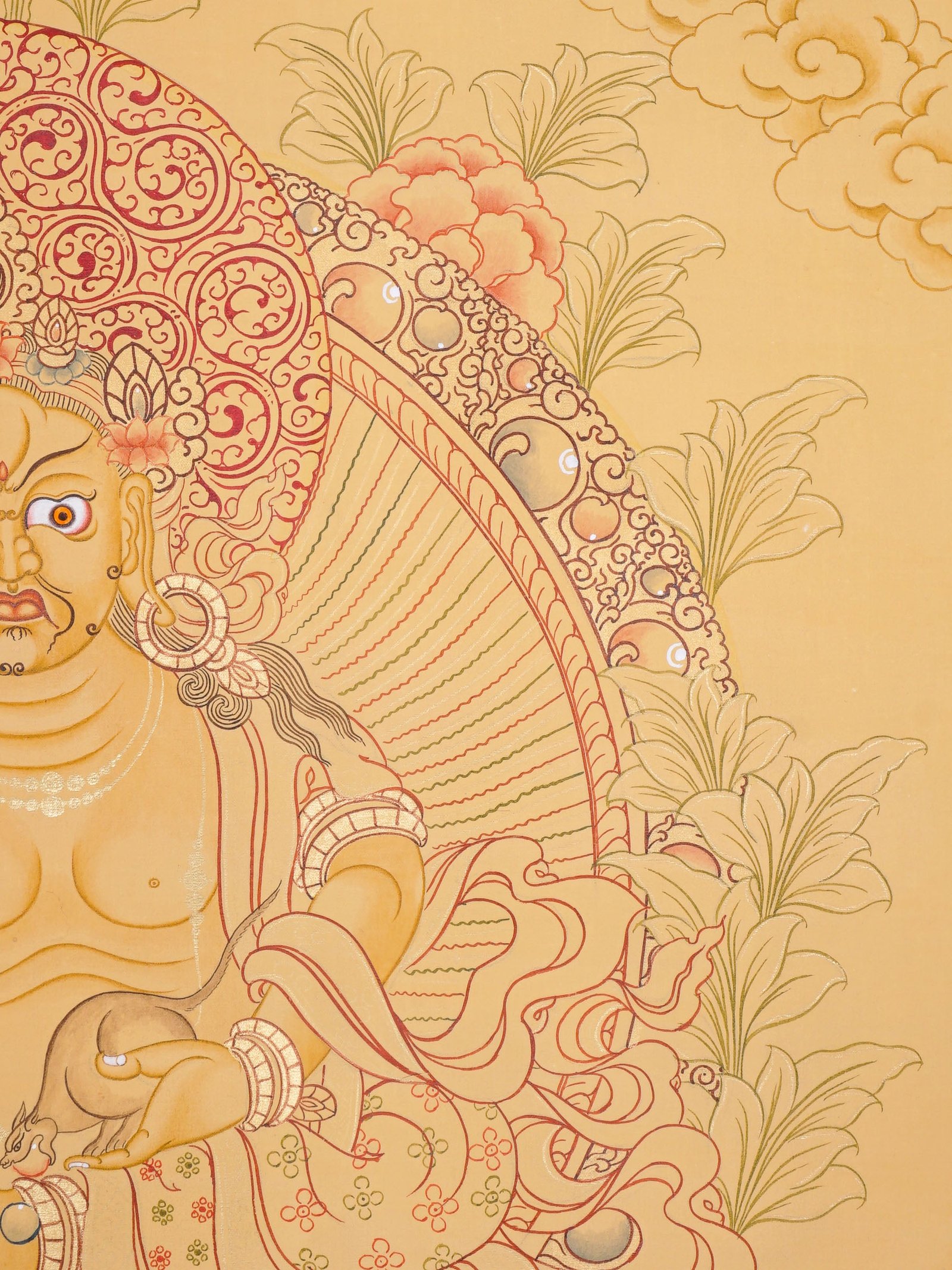 - Central Figure of Zambala: The central figure is Zambala, a deity associated with wealth and generosity, depicted with a plump and benevolent appearance. Typically seen with a compassionate and peaceful expression, he is known as a provider of wealth and prosperity.