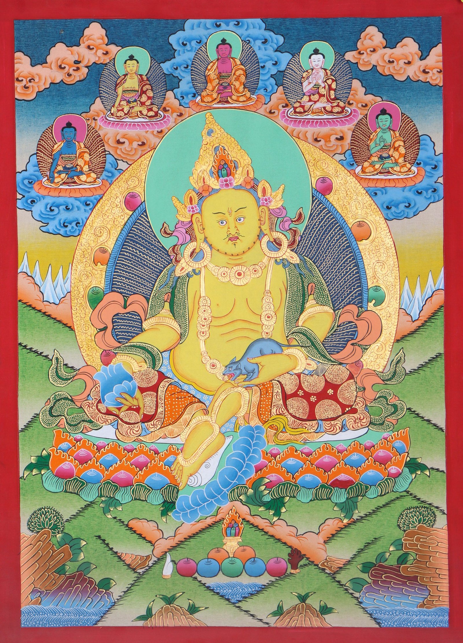 In a Zambala thangka, Zambala is often depicted as a youthful figure, adorned with jewels and golden ornaments, symbolizing his connection to material and spiritual wealth. He is seated on a lotus throne, holding a mongoose in his left hand, which spews forth precious jewels, signifying the bestowal of prosperity and abundance. This symbol of wealth is thought to bring its owner luck, success and protection, and has become a popular way to bring the energies of prosperity into everyday life.